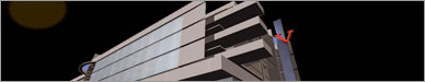 This building is a three part composition of two layered and stepped terra cotta and glass clad rectangular volumes wrapping around a redwood lined drum open to the sky.