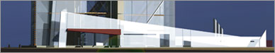 A mix of transparency and translucency combine in this all glass modernist composition, designed as an icon in the landscape of the Docklands, which rises in three parts to the “ main parapet” level at a height of 50 meters above the street. Above this level U2 recording studios rise to the south at 45 degrees to a height of approximately 85 meters. The bands environment includes an acoustic glass recording studio and several levels of terraced mezzanine balconies that step back along the angle of the glass roof atop the tower. Penetrating the tower, at the level of the studio is a parallelogram cut-out that contains the sky- garden. The majority of the south point block element contains flexible commercial office space. The northern point block element is devoted to residential occupancy. Accommodation is possible for several sizes and configurations of flats ranging from small studio apartments to multistory mezzanine units. Connecting the two primary point block elements a glass-enclosed hall rises above the podium to the level of the main parapet. Elevator lobbies, connector bridge conference spaces and apartments all surround and look into this central space which serves to disaggregate and dematerialize the mass of the composition from the exterior. Ground level contains the main building lobby with its sub lobbies for commercial and residential occupants. The bar, nightclub and restaurant are also located on the ground level and on the first floor above. The first floor nightclub features a glass dance floor suspended in the central hall and a terraced dinning room for the restaurant centered on the bandstand. The bandstand, a rotated cube, cantilevers out towards the Dodder River and is visible from both levels of the club and from the riverside. The bar and central stair for the club, along with a large hearth are housed in the wedge to the east, facing the Dodder. Outdoor dinning areas flank the northeast and northwest corners at ground level, allowing for café style interaction with the street and a view of the intersection of the two rivers. All vehicular traffic enters the site from the Britain Quay. A covered pedestrian drop off at the main entrance, a private arrival court for the band, entrance to the subterranean parking facility and access to the loading dock and service building are all located behind the sloping wall that forms the visual base of the complex from the west. Below grade parking for 35 cars and 45 scooters surrounds separate elevator lobbies for the residential and the commercial occupants. The band has their own private garage, lobby and elevator which gives them direct, discreet and private access to the ground floor, the nightclub at level one and to the levels of the recording studio atop the south point-block.